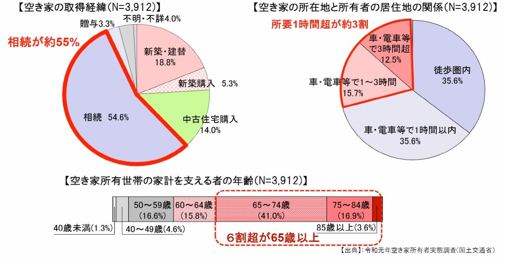 また、空き家の所在地と所有者の居住地の関係をみると、約30%が車や電車で1時間以上の遠隔地となり、空き家所有世帯の家計を支える者の年齢の6割超が65歳以上となっております。