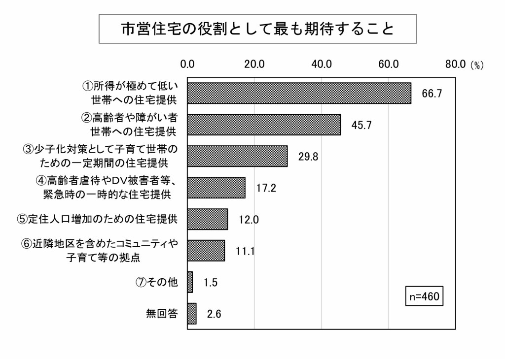 ・期待される役割は「所得が極めて低い世帯への住宅提供」が最も多く、次いで「高齢者や障がい者世帯への住宅提供」となっています。